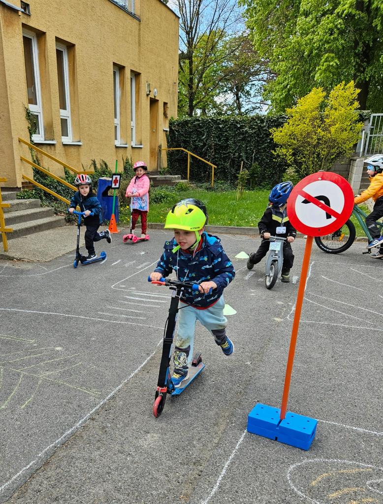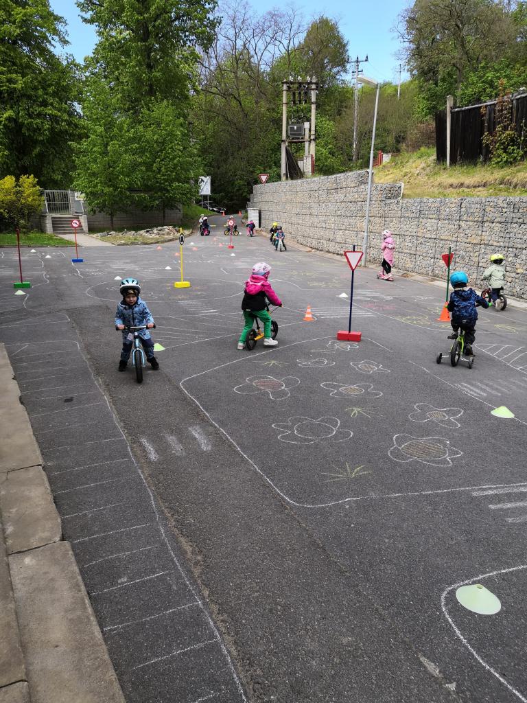 I letos mohly děti plnit úkoly s dopravní tématikou a zajezdit si na nakresleném dopravním hřišti před školkou.