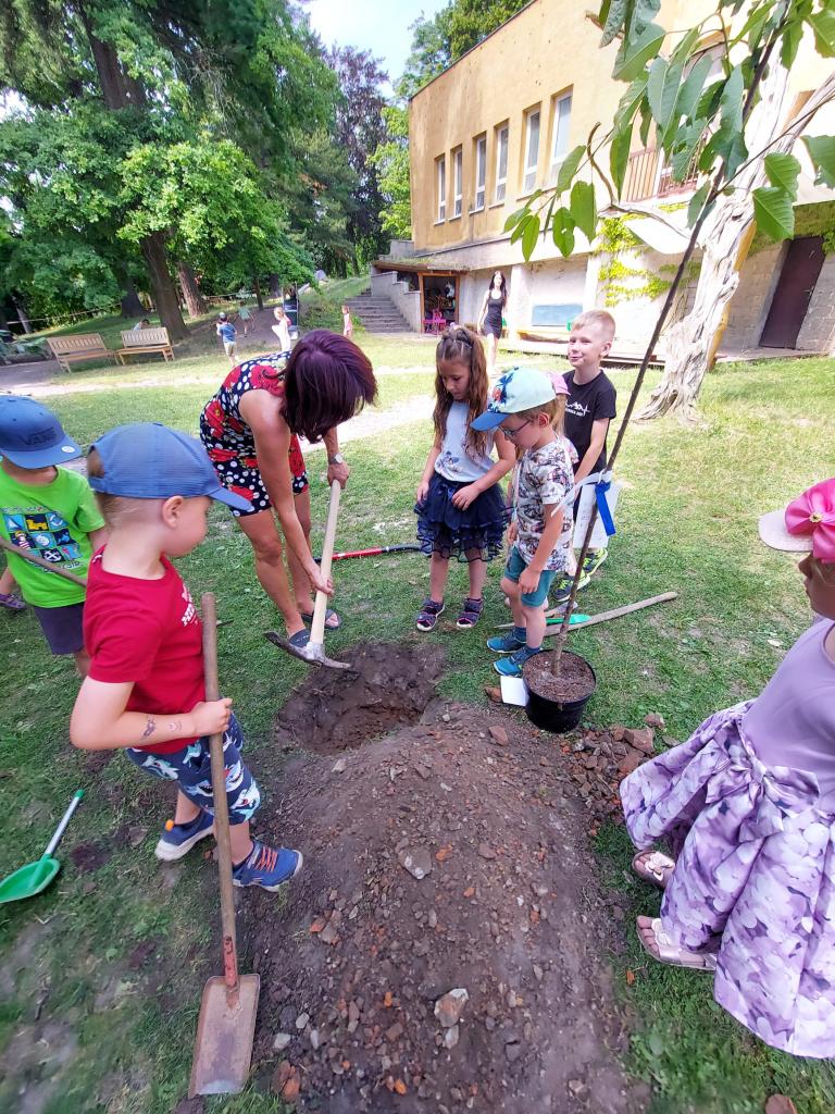 Od paní Vosmíkové jsme dostali třešeň, kterou jsme si ještě na konci školního roku stihli s předškoláky zasadit.